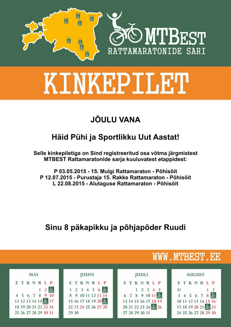 MTBEST rattamaratonide sarja kinkepilet on suurepärane võimalus teha kingitus pereliikmele, sõbrale, töö- või treeningkaaslasele või hoopis konkurendile! Kingituste valikus on kingi saaja osalemine mõnel või mitmel etapil ning miks mitte ka kõikidel sarja etappidel.